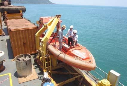 | Nhân viên cảng vụ hàng hải kiểm tra xuồng cứu hộ tàu hút cát dự án Formosa. |