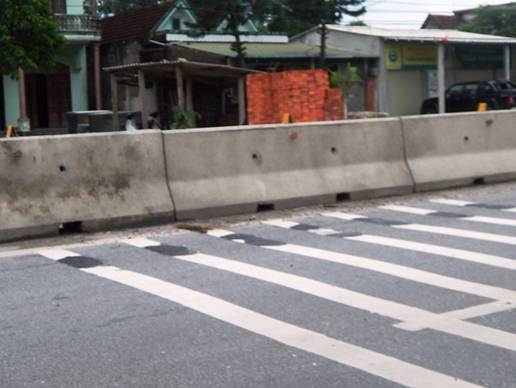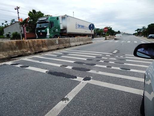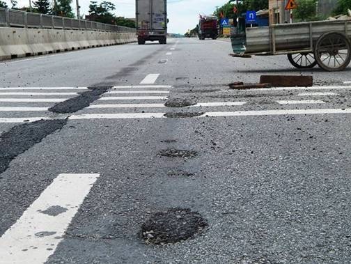 Trên mặt đường bị sủi đen, bóc nhựa và bong tróc các lớp đá, xuất hiện từng lỗ tròn đường kính khoảng 3 - 4cm, sâu khoảng 1- 3cm. Điều đáng nói là tất cả các hố này đều xuất hiện ngay trên vạch sơn kẻ đường.