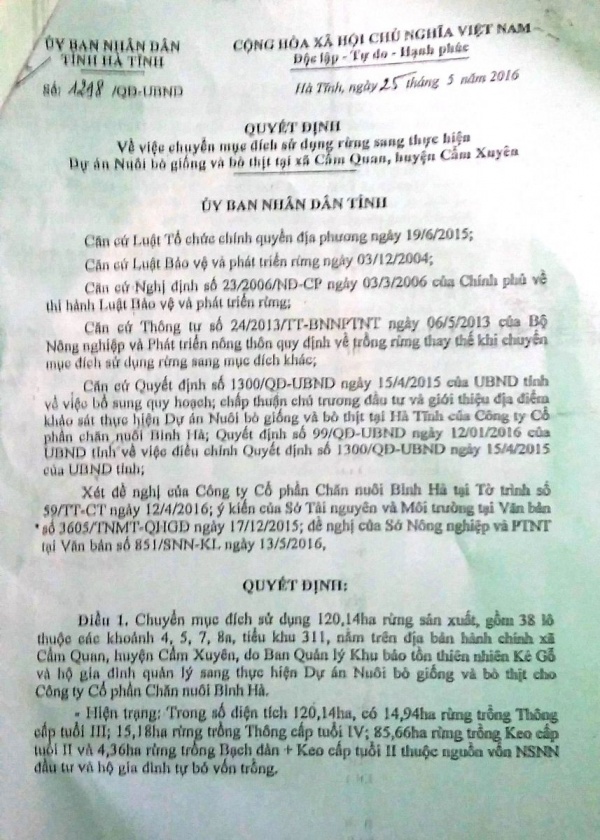 Tiếp đó, công ty Bình Hà có tờ trình số 59/TTr – CT ngày 12/4/2016 về việc chuyển đổi mục đích sử dụng 120,14 ha đất rừng ( gồm 38 lô thuộc khoảnh 4,5,7,8a, tiểu khu 311 trên địa bàn xã Cẩm Quan ) sang thực hiện chăn nuôi bò giống. Về phía UBND tỉnh Hà Tĩnh, sau khi nhận được tờ trình, ngày 25/05/2015, UBND tỉnh có quyết định số 1248/QĐ – UBND , do ông Đặng Ngọc Sơn, PCT UBND ký về việc chuyển mục đích sử dụng 120, 14 ha đất rừng tại xã Cẩm Quan sang thực hiện dự án nuôi bò giống, bò thịt.
