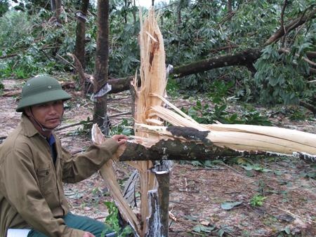 Giám đốc nông trường Trương Tiến Lương cúi gục bên cây cao su đổ gãy nói: Bão số 10 đã gây lên cơ sự đau đớn cho cả nông trường chúng tôi, sau bão hơn 200 công nhân trắng tay không biết rồi cuộc sống sẽ ra sao đây.